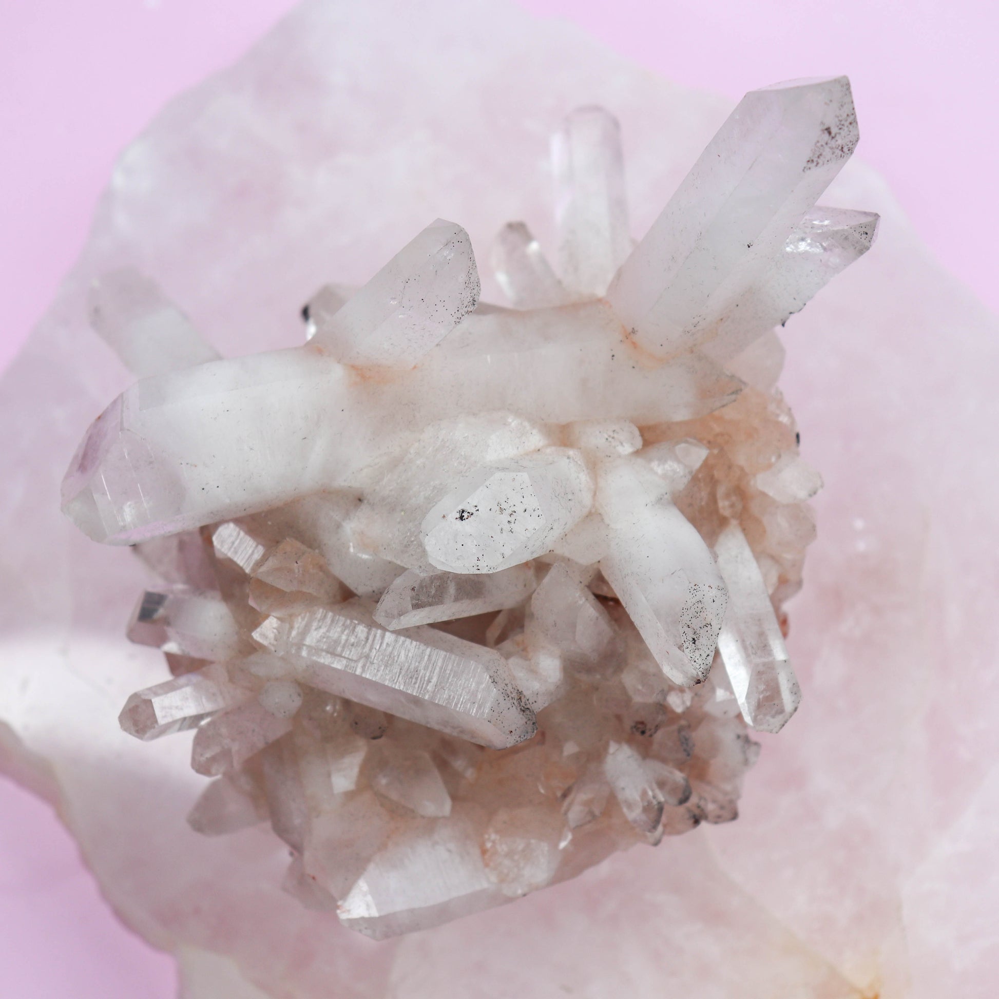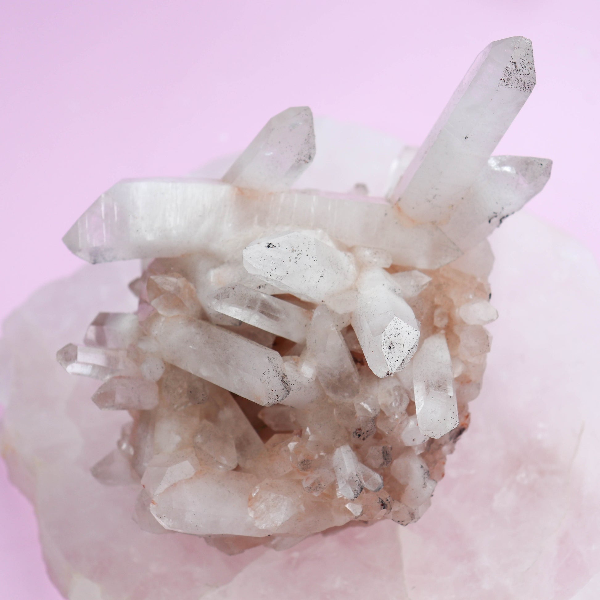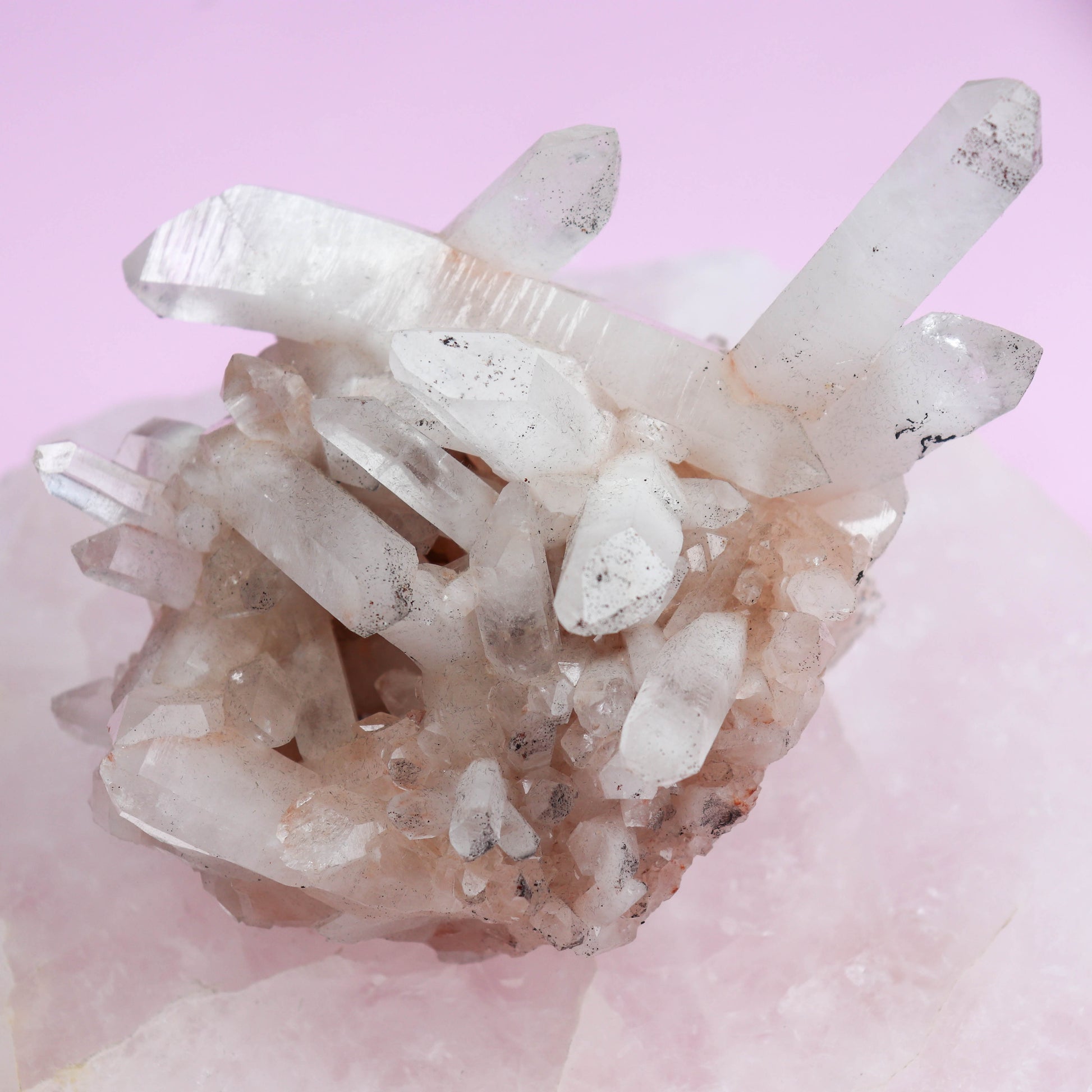 Rare pink quartz found in cluster formations; natural color from trace elements or mineral inclusions; Mohs 7