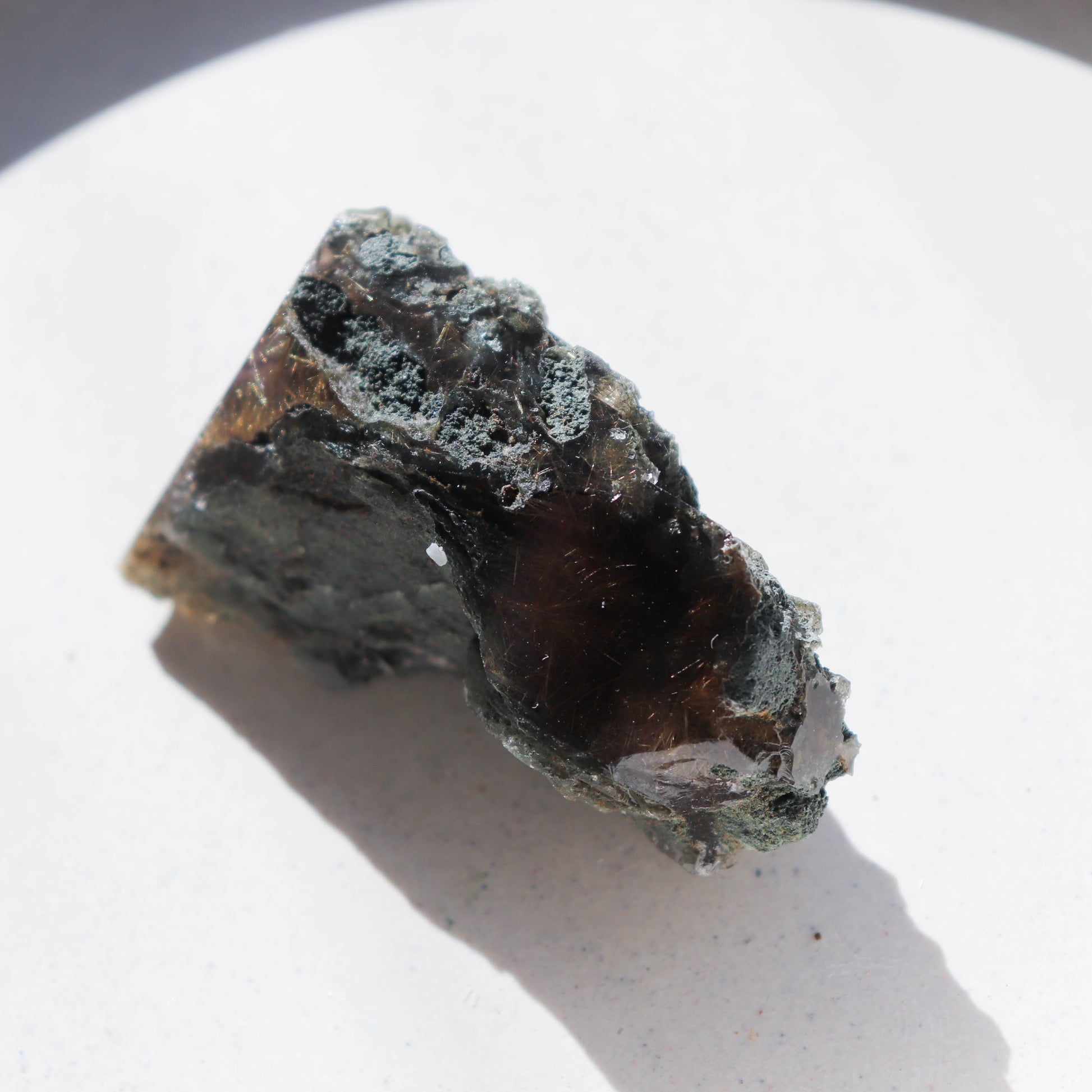 Titanium dioxide mineral; often forms as golden, silver, or reddish needle-like inclusions in quartz; Mohs 6–6.5